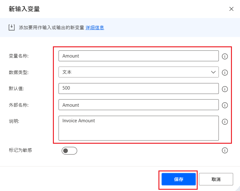 变量类型可以是输入,也可以是输出。 此示例使用输入变量;稍后会介绍输出变量。 变量名称是在桌面流中使用和引用的名称。 外部名称在桌面流之外使用,描述字段向您提供有关变量的详细信息,如果您在同一桌面流中有很多不同的输入和输出变量,此字段会非常有用。 默认值可以让您在无输入的情况下定义要使用的值。 数据类型字段有助于进一步定义变量的数据类型,并可以确定 Power Automate 处理数据的方式。 例如,使用敏感文本数据类型可以对这些值进行加密,从而帮助保护敏感数据。 您可以对用于打开安全程序的密码或其他个人或隐私信息使用此数据类型。 您可以自行设置变量的值,也可以使用默认值(如以下屏幕截图所示)。 单击保存以创建变量。