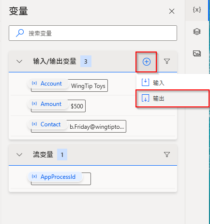 若要定义输出变量,请选择输入/输出变量部分旁边的加号 (+) 图标,然后选择输出。