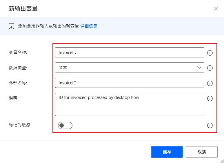 输出变量在流的流程中定义,无论是在桌面流输入并保存发票后创建的发票编号,还是合计或 ID 字段。 它们通常是输入的结果,可以稍后在流中使用,甚至在其他应用中使用,包括云端流。