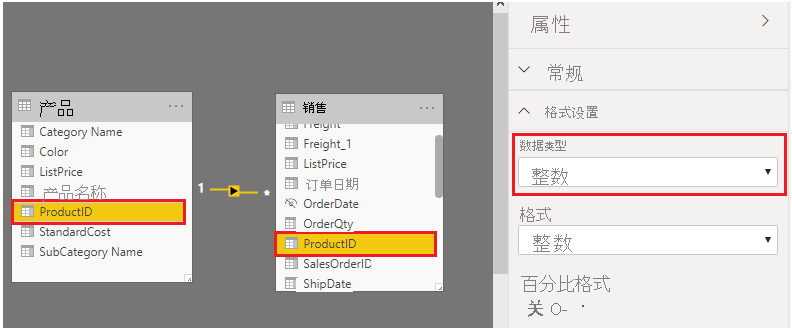 在以下示例中,ProductID 列在 Product 和 Sales 表中都具有整数数据类型。