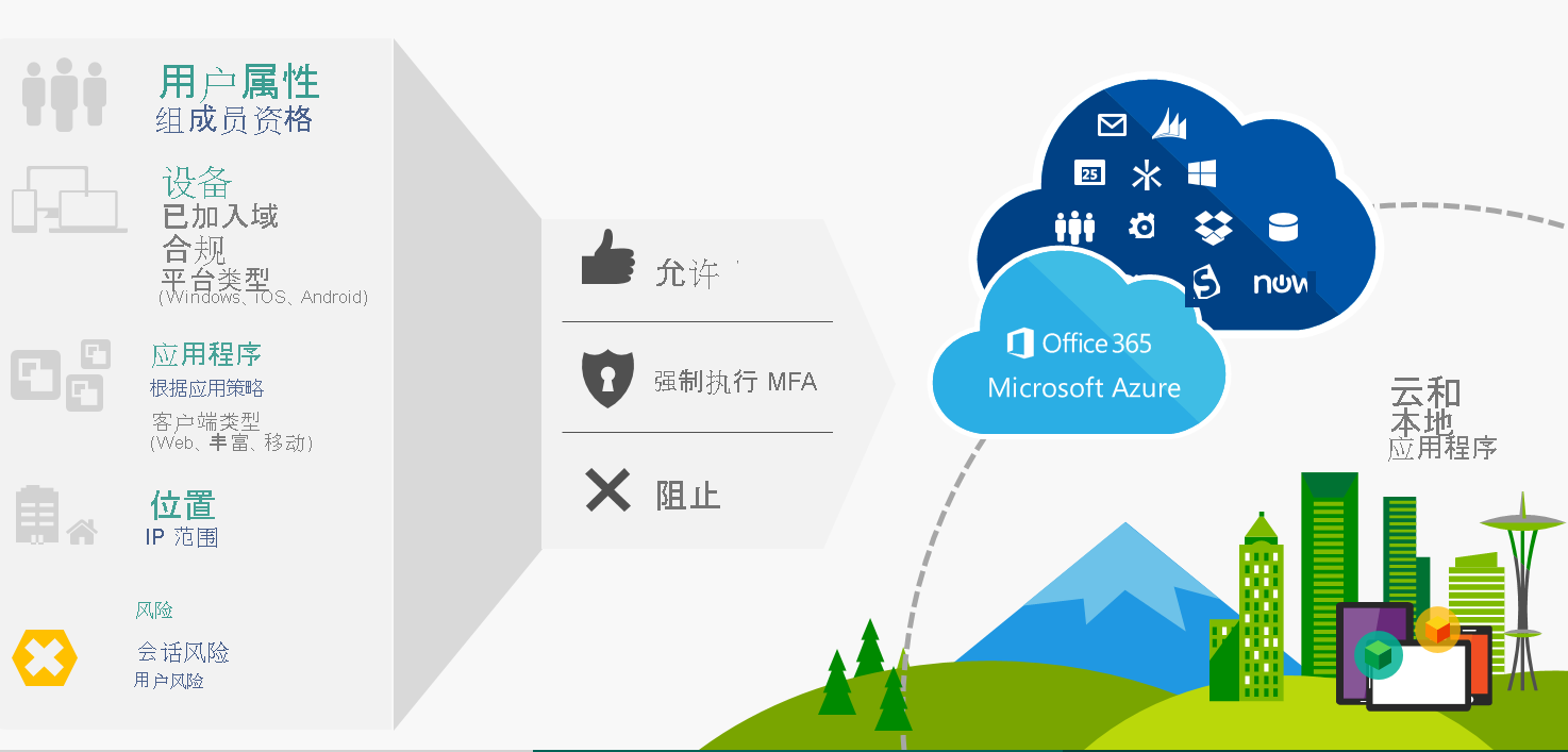 例如,条件访问允许你控制可以连接到电子邮件的设备和应用。 条件访问提供精细访问控制,使企业数据安全,同时为最终用户提供一种体验,使他们能够从任何设备执行最佳工作。 事实上,可以根据位置、设备、用户状态和应用程序敏感度来定义限制对公司数据的访问的条件。
