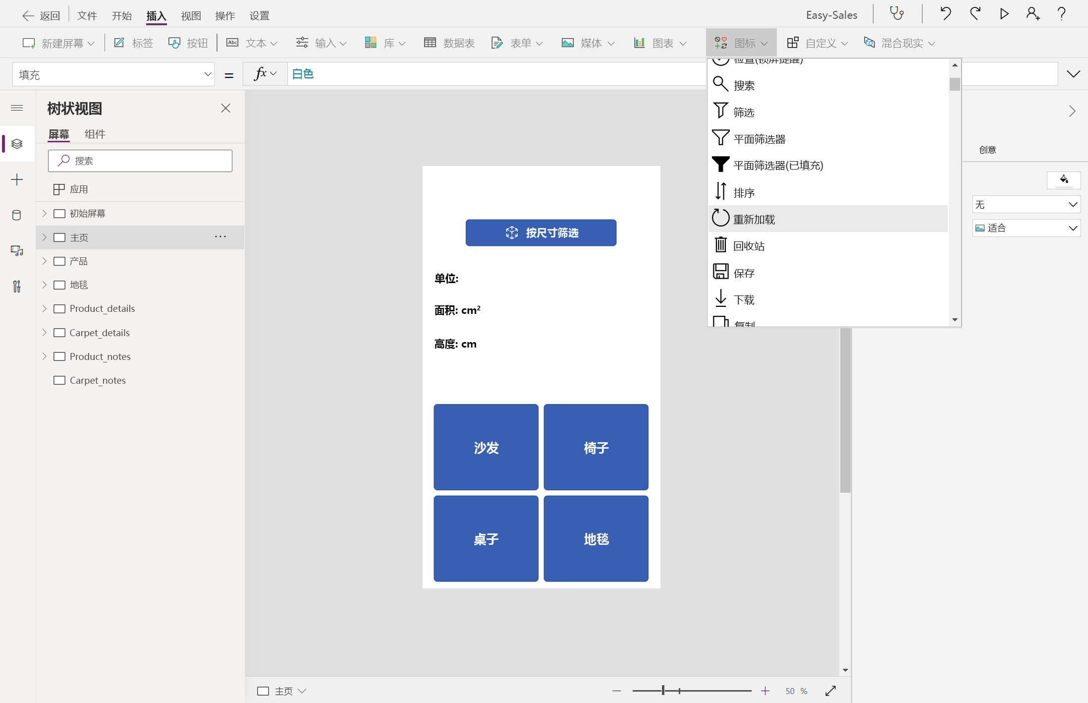8. 让我们添加一个刷新图标,以便在用户对测量结果不满意时重新进行测量。 在 “插入 ”选项卡上,展开 “图标 ”下拉列表,然后选择 “重载 ”图标。