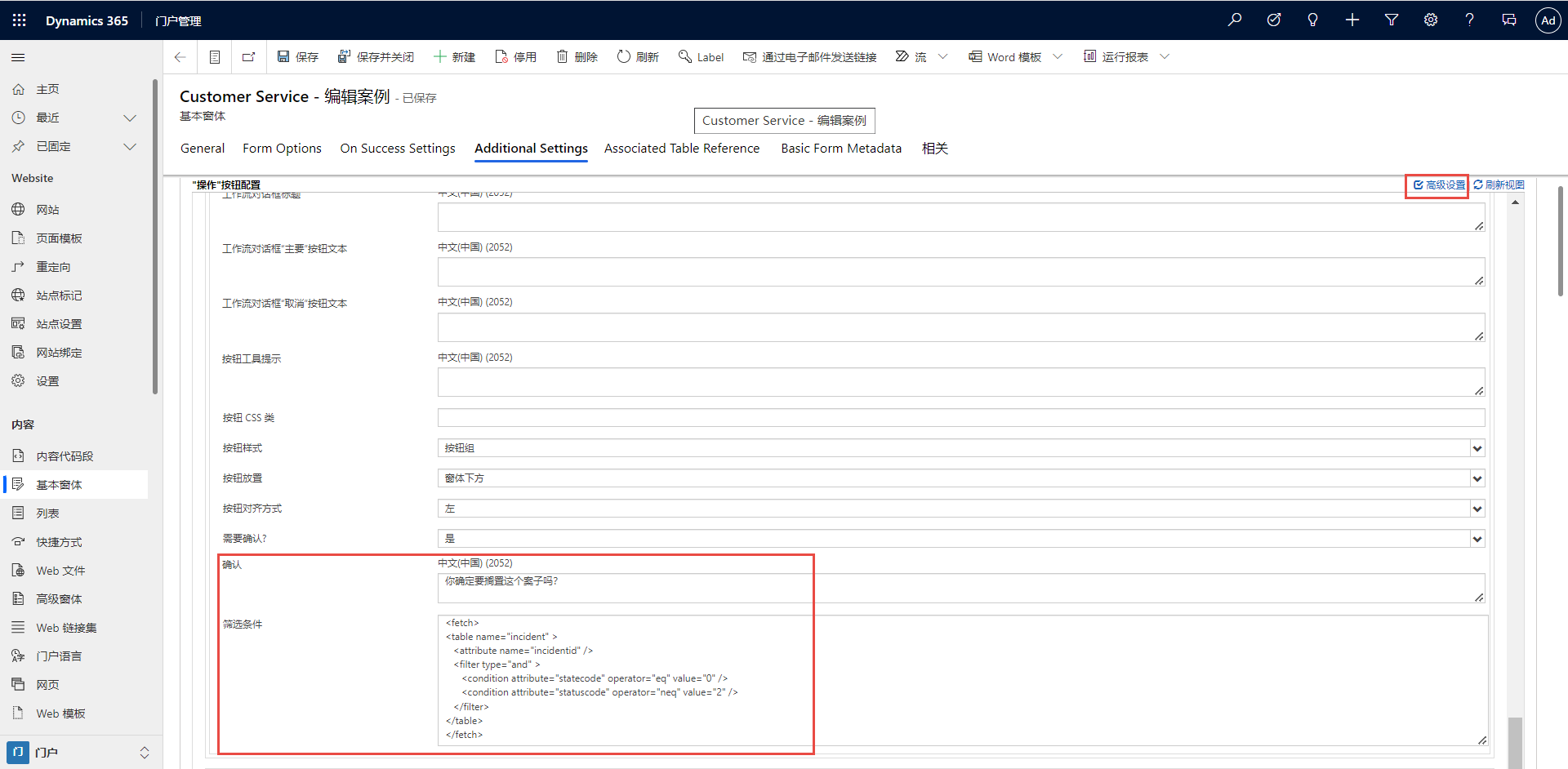 <fetch> <table name="incident" > <attribute name="incidentid" /> <filter type="and" > <condition attribute="statecode" operator="eq" value="0" /> <condition attribute="statuscode" operator="neq" value="2" /> </filter> </table> </fetch>此 FetchXML 确保按钮仅在案例可用 (