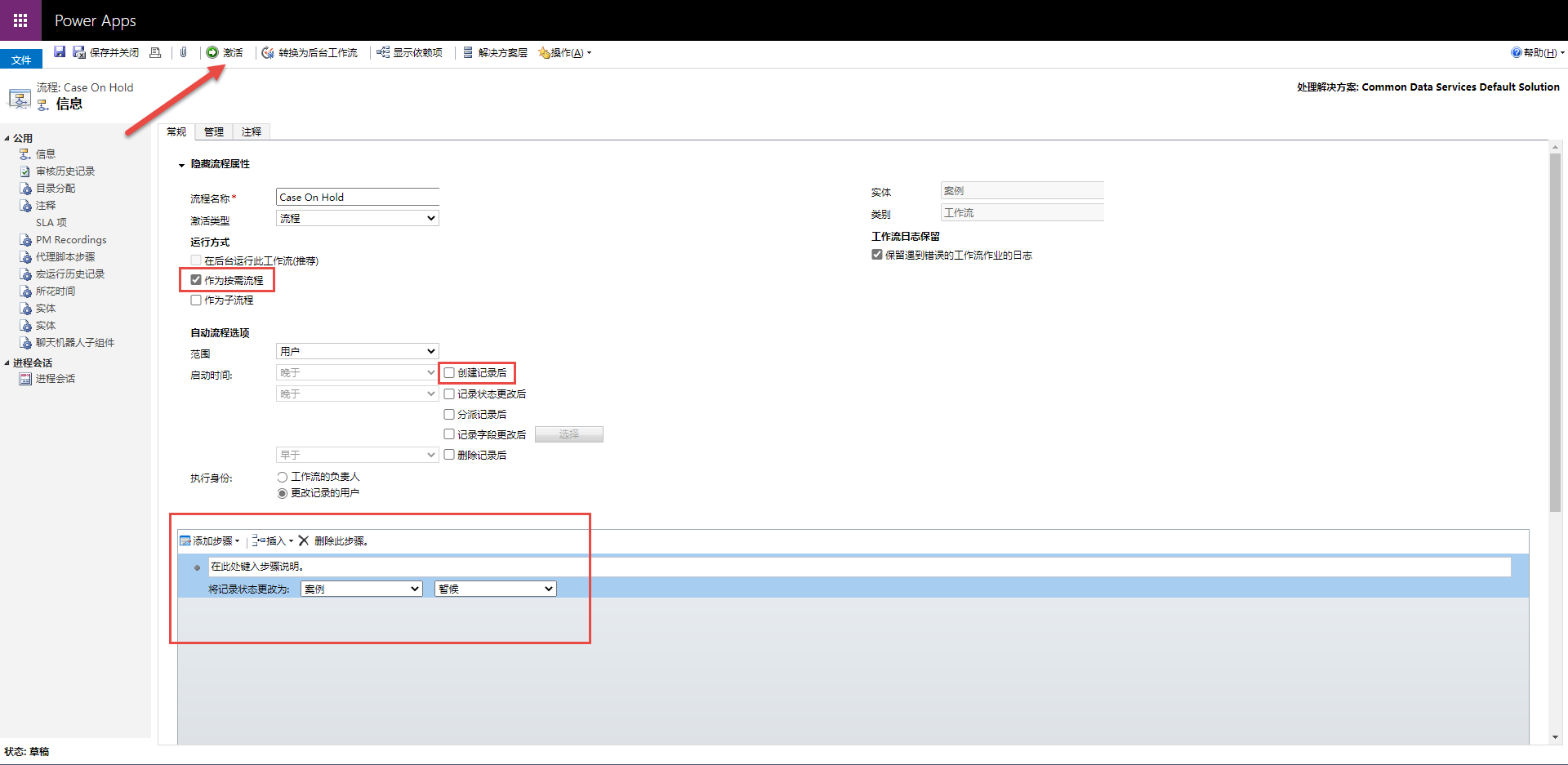 为案例表创建实时工作流,将案例状态设置为暂停。