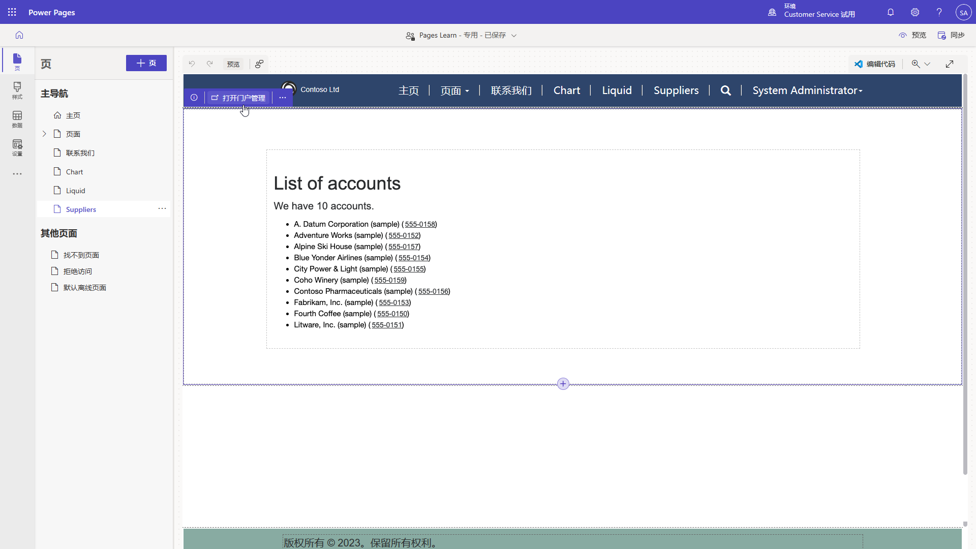 在本练习中,您将使用 Power Pages 设计工作室代码编辑器向网页添加一些 HTML 和 Liquid 代码,以便显示选定的 Dataverse 记录。