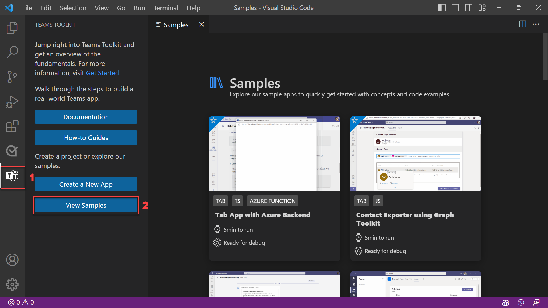 在 Teams Toolkit for Visual Studio Code 中,选择“查看示例”并查找感兴趣的示例,然后选择屏幕截图以打开该示例的页面。