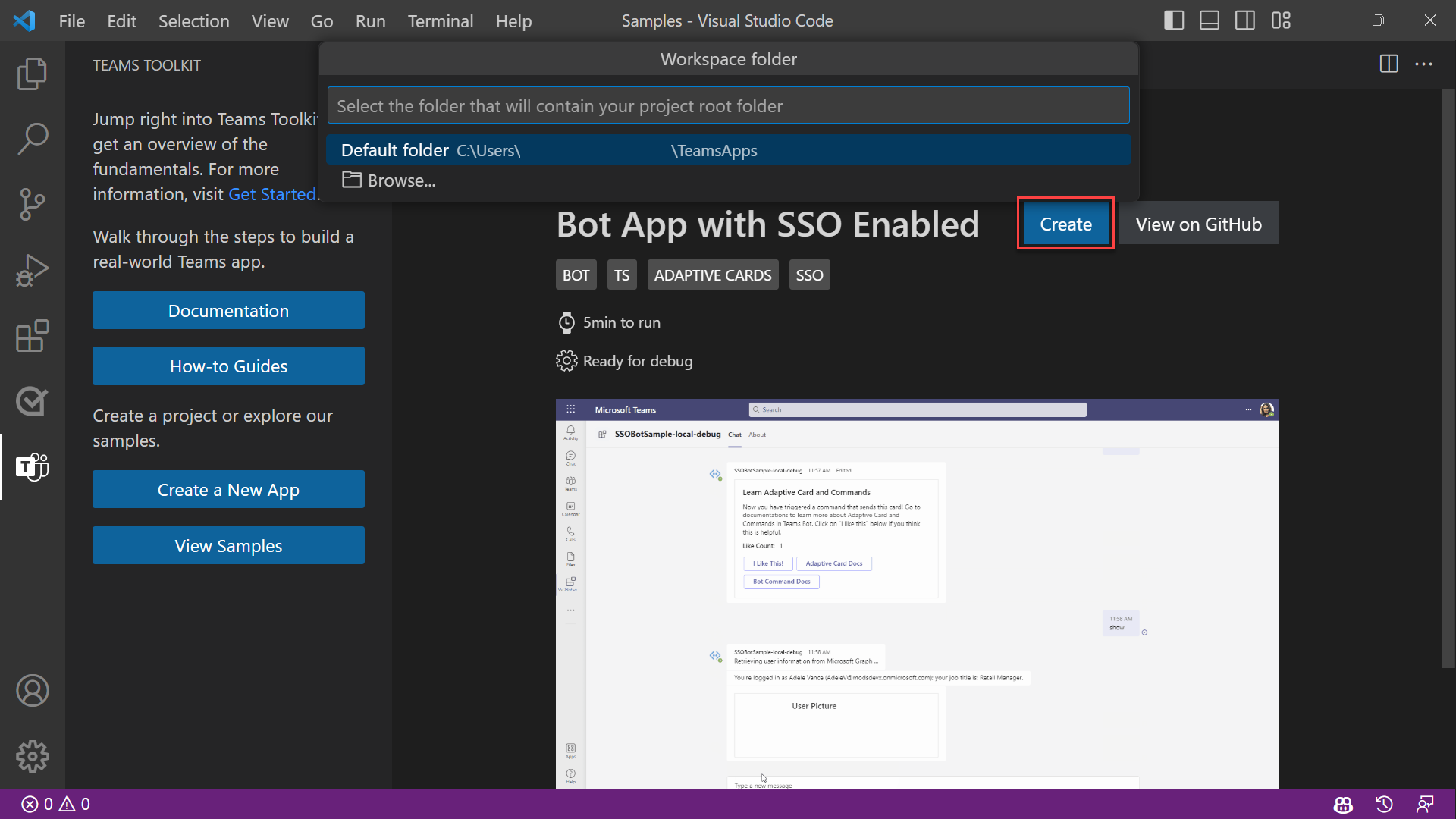 在示例页上,选择“ 创建 ”并选择用于保存项目的文件夹。 项目将在此本地文件夹中搭建基架。 基架完成后,你将看到一个新的Visual Studio Code窗口,其中加载了Hello World机器人项目。