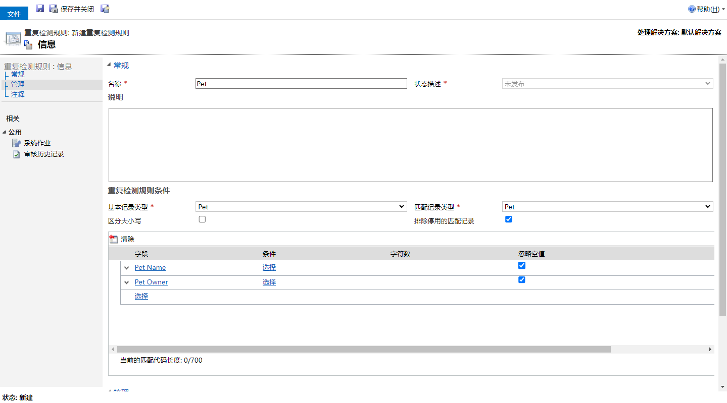 要检测重复,您需要定义规则来确定潜在的重复数据。 您只能为已启用重复检测的表创建重复检测规则。