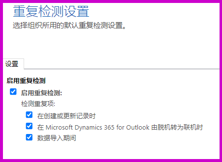 必须在 Power Platform 管理中心的数据管理部分下,在环境设置中启用重复检测。