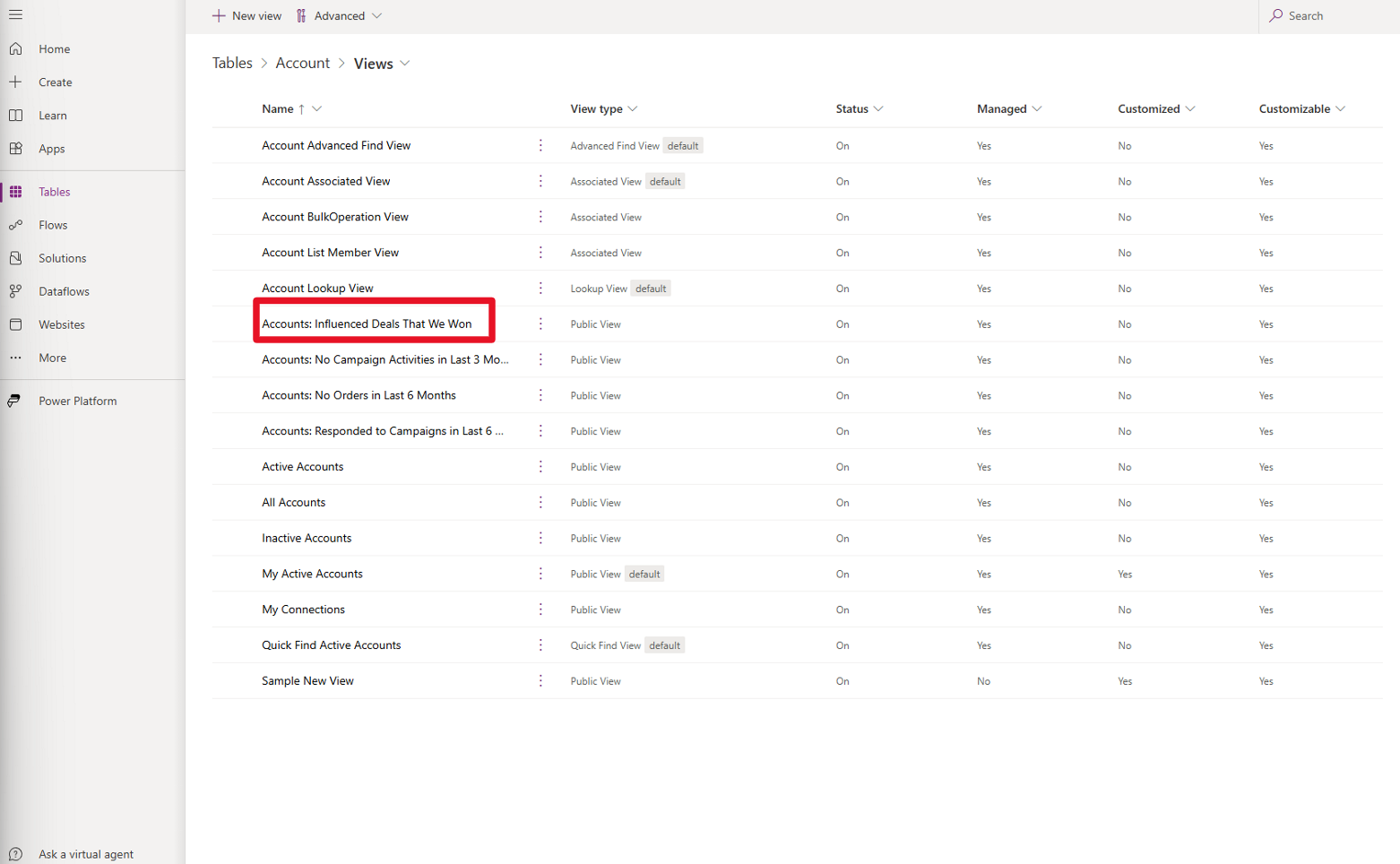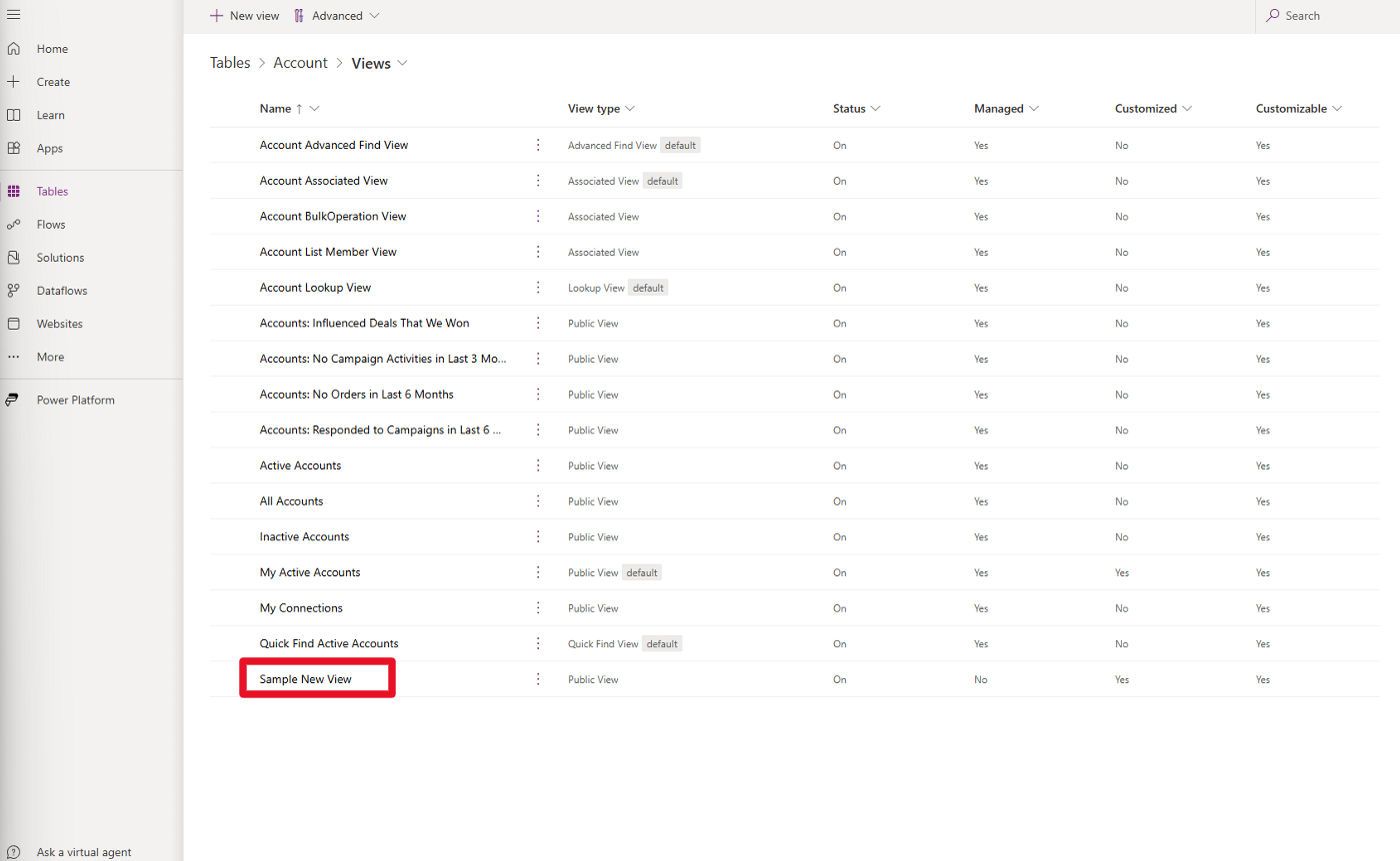 若要在 Power Apps Maker Portal 中为表修改视图,请导航到表的视图列表并按照以下步骤操作: