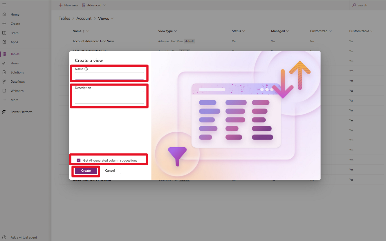 为视图提供名称和描述,选择是否希望 AI 帮助生成列建议,然后选择创建。