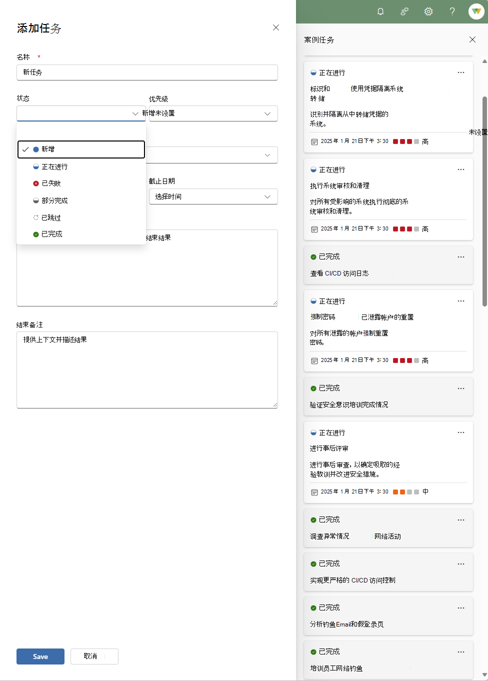 添加任务以管理案例的精细组件。 每个任务都有自己的名称、状态、优先级、所有者和截止日期。 通过此信息,你始终知道谁负责在什么时间完成哪个任务。 任务说明总结了要完成的工作以及描述进度的一些空间。 结束注释提供了有关已完成任务结果的更多上下文。