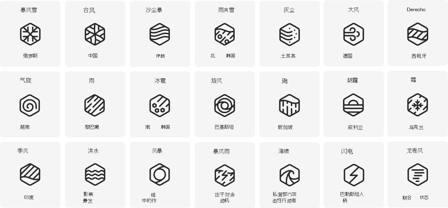 在此分类中,天气事件或 姓氏 表示上述类别之一。 对于民族国家参与者,我们为原产国/地区分配了一个与归属相关的姓氏。 例如,台风指示起源或归属于中国。 对于其他参与者,姓氏表示动机。 例如,Tempest 指示出于财务动机的参与者。
