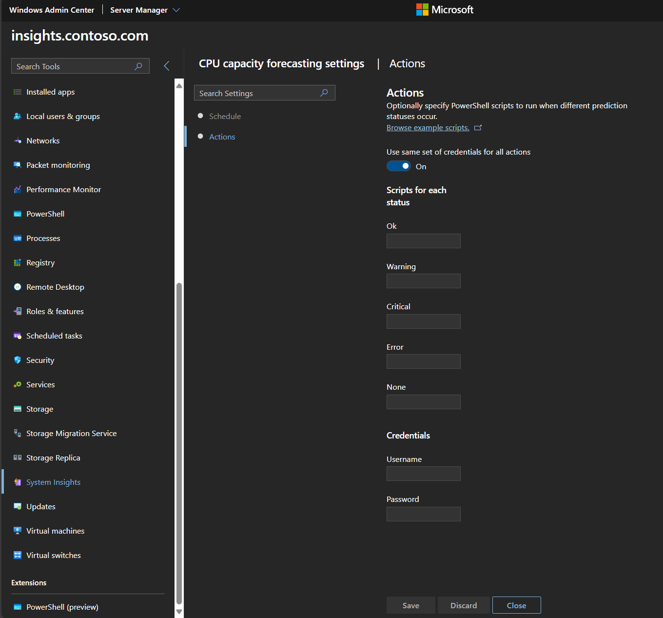 Set-InsightsCapabilityAction -Name "CPU capacity forecasting" -Type Warning -Action "C:\Users\Public\WarningScript.ps1" -ActionCredential $Cred