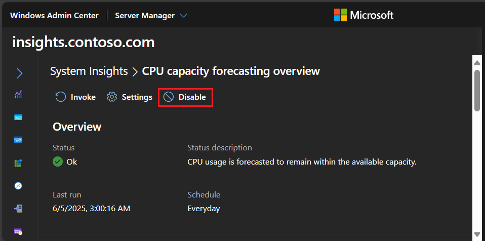 可以管理和配置 System Insights 功能以满足部署需求。 本文介绍如何使用 PowerShell 或 Windows Admin Center 调整每个功能的设置,并提供分步示例和屏幕截图。