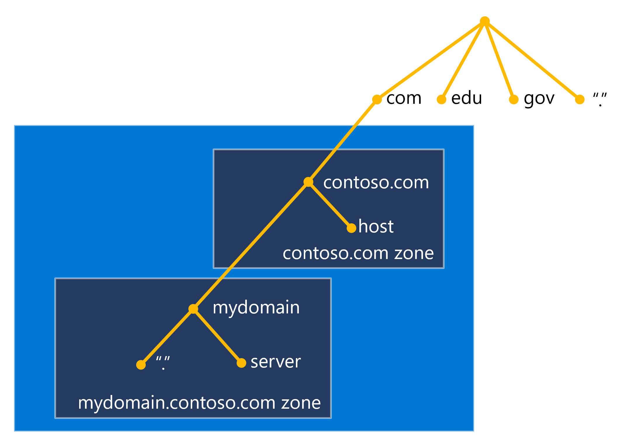 DNS 作为包含各种类型的数据(包括主机名和域名)的分层分布式数据库实现。 DNS 数据库中的名称构成了称为域命名空间的分层树结构。 域名由用点分隔的各个标签组成,例如: mydomain.contoso.com