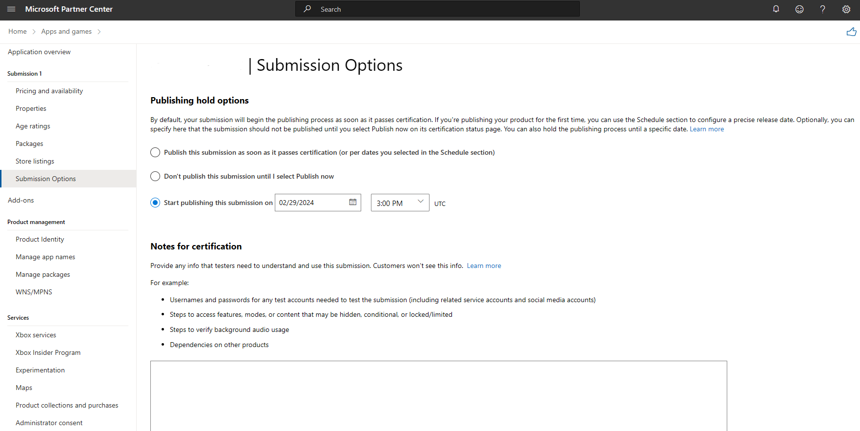 当你提交应用时,你可以选择使用“认证说明”页面向认证测试人员提供额外信息。 此信息有助于确保正确测试你的应用。 对于使用 Xbox Live Services 和/或需要登录到帐户的产品,包括这些说明尤其重要。 如果我们不能完全测试你的提交,它可能无法通过认证。