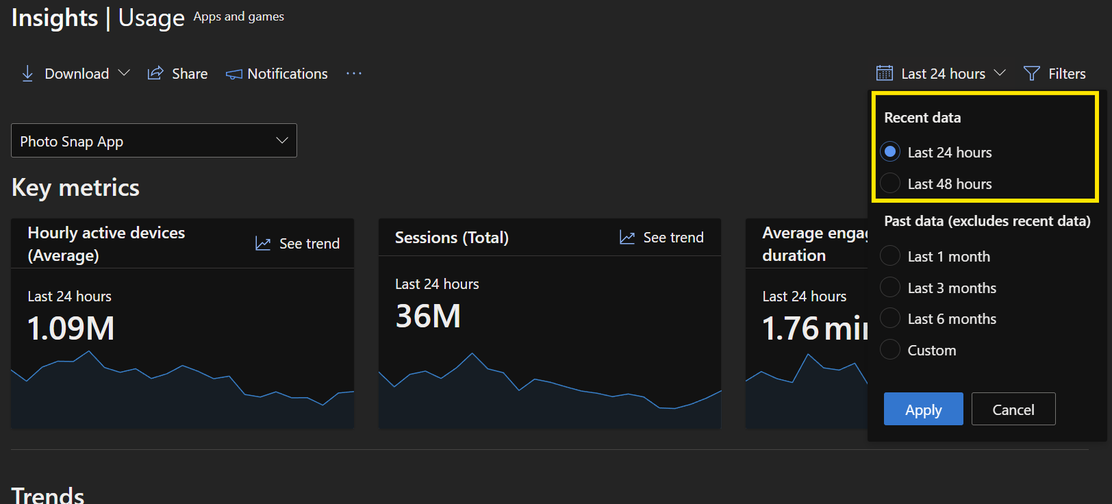 无需进行其他设置。 登录到合作伙伴中心,选择你的应用,并打开 使用情况 分析以浏览最近数据视图,并了解用户在过去 24 到 48 小时内如何与你的应用互动。