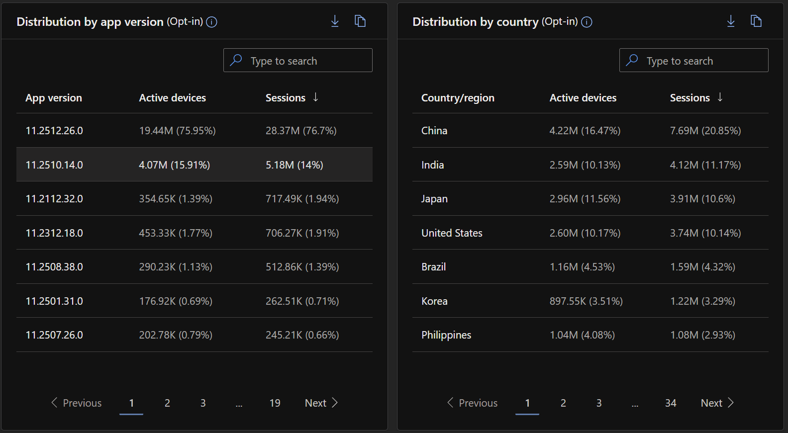 - 按应用版本和国家/地区分布:分析最近使用情况在应用版本和区域之间分布的方式。