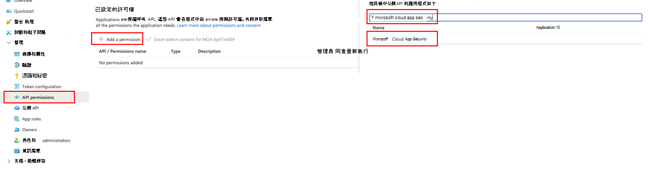 若要讓您的應用程式能夠存取 Defender for Cloud Apps 並指派「讀取所有警示」許可權,請在應用程式頁面上選取 [API許可權][新增>我的組織使用的>許可權 API>],輸入 Microsoft 雲端 App 安全性,然後選取 [Microsoft 雲端 App 安全性]。