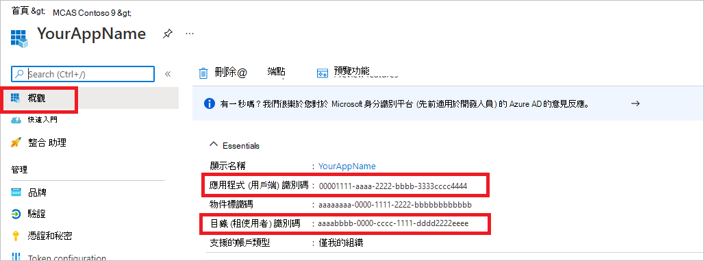 記下您的應用程式識別碼和租用戶標識碼。 在應用程式頁面上,移至 [概觀],並將 [應用程式 (用戶端) 標識符和目錄 (租使用者) 標識符複製。