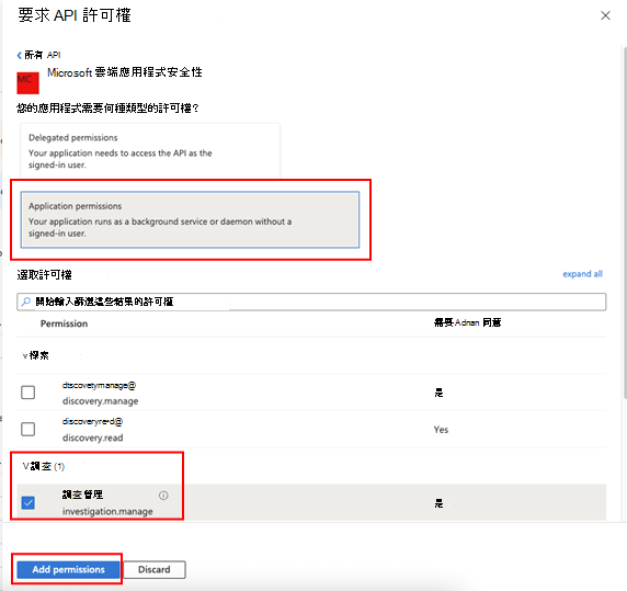 您必須選取相關的許可權。 Investigation.Read 只是一個範例。 如需其他許可權範圍,請參閱 支援的許可權範圍