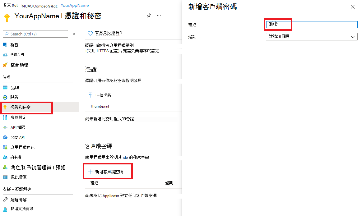 若要將秘密新增至應用程式,請選取 [ 憑證 & 秘密],然後選取 [ 新增客戶端密碼]。 將描述新增至秘密,然後選取 [ 新增]。