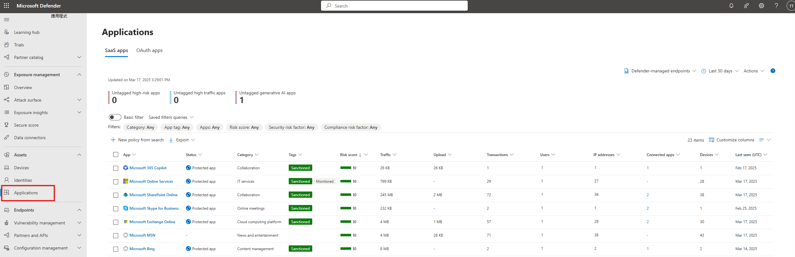 - SaaS 應用程式:整合你網路中所有 SaaS 應用程式的視圖。 此分頁會強調關鍵細節,包括應用程式名稱、狀態 (未受保護/受保護的應用程式) ,以及該應用程式是否被標記為授權或未授權。
