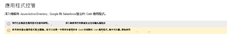 OAuth 應用程式標籤提供 Microsoft 365、Google Workspace 與 Salesforce 的可視化。 管理員可以審查應用程式,決定停用應用程式或套用政策監控其在環境中的行為。