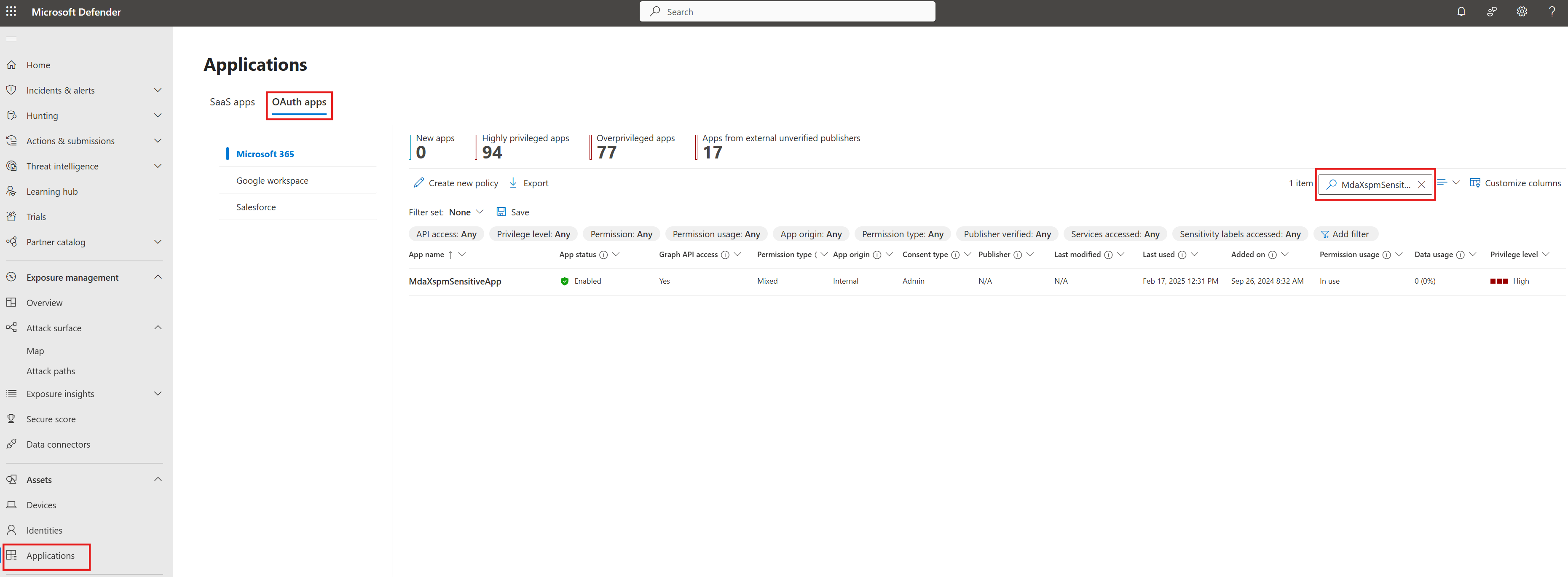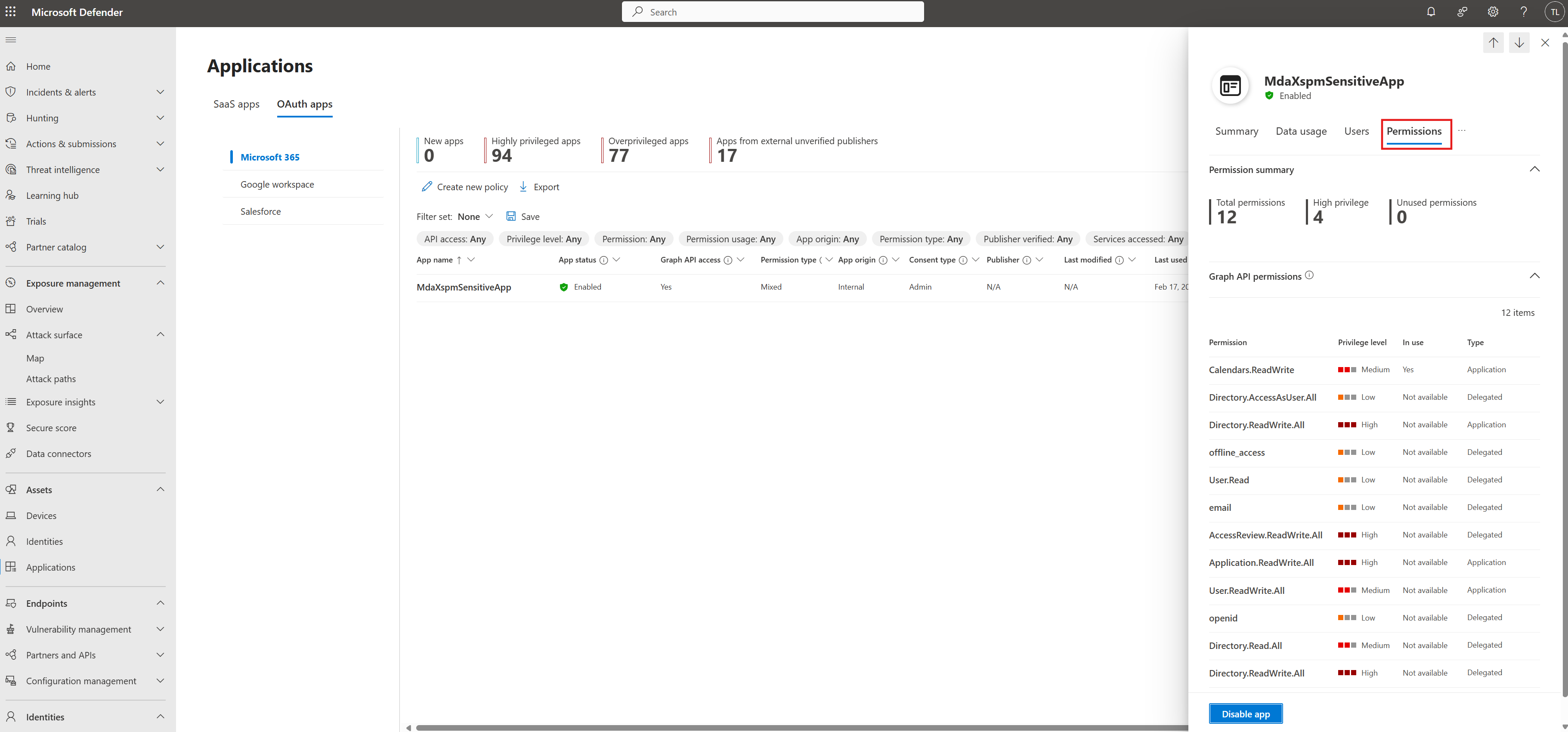 Microsoft Defender for Cloud Apps 定義了一組關鍵權限 OAuth 權限。 擁有這些權限的 OAuth 應用程式被視為高價值資產。 若遭入侵,攻擊者可獲得 SaaS 應用的高權限。 為了反映此風險,攻擊路徑將擁有這些權限的服務主體視為目標目標。