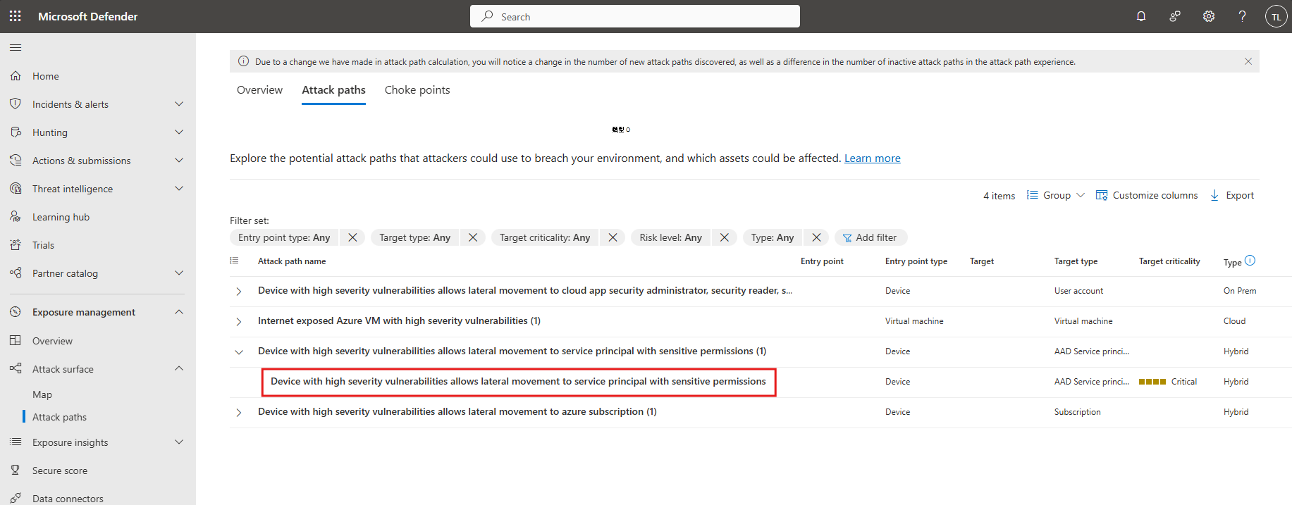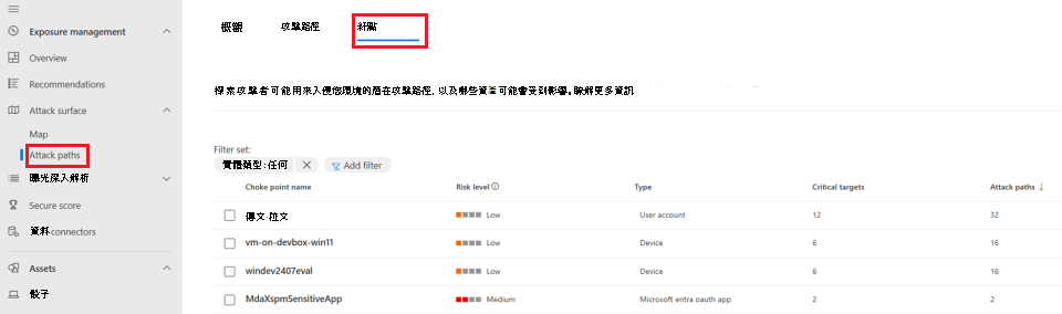 請前往「暴露管理 > 攻擊面 > 攻擊路徑」。