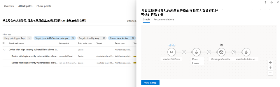 選擇標題為:「具有高嚴重性漏洞的裝置允許以敏感權限橫向移動至服務主體」的攻擊路徑