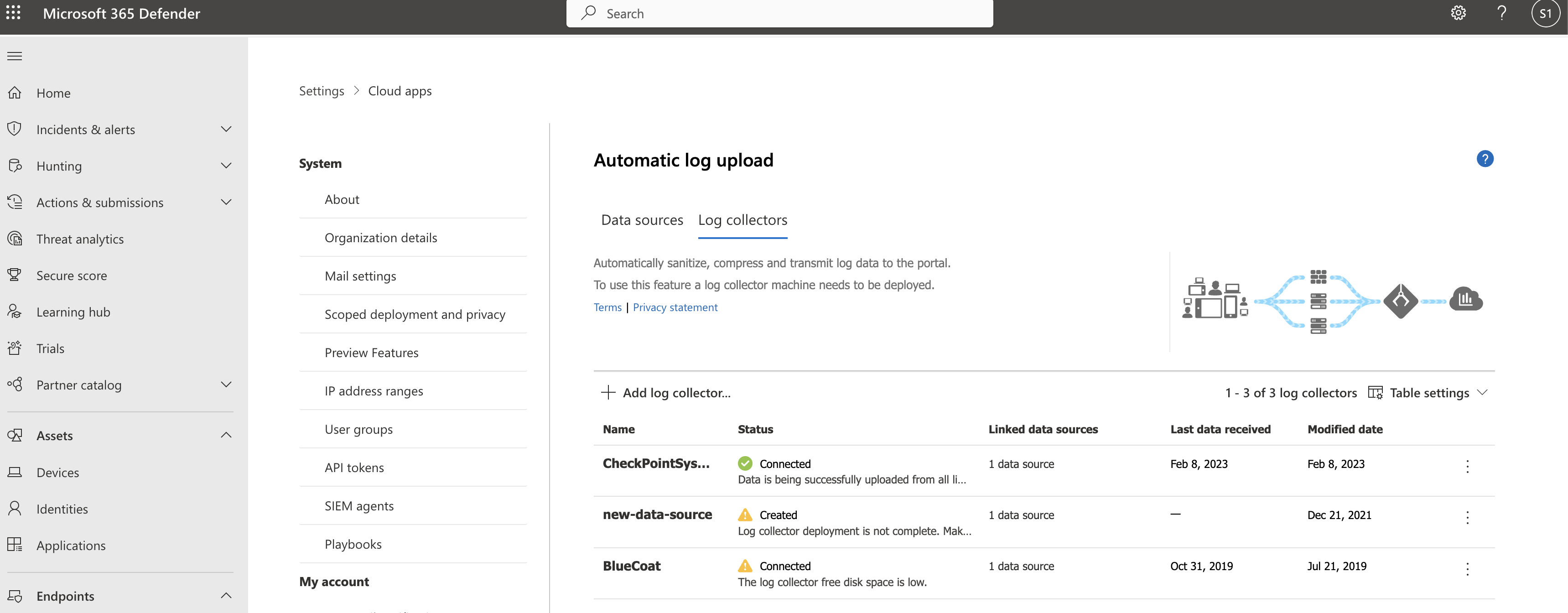 在 Microsoft Defender 入口網站中,選擇設定>、雲端應用程式>、雲端發現>、自動日誌、上傳>資料來源標籤。