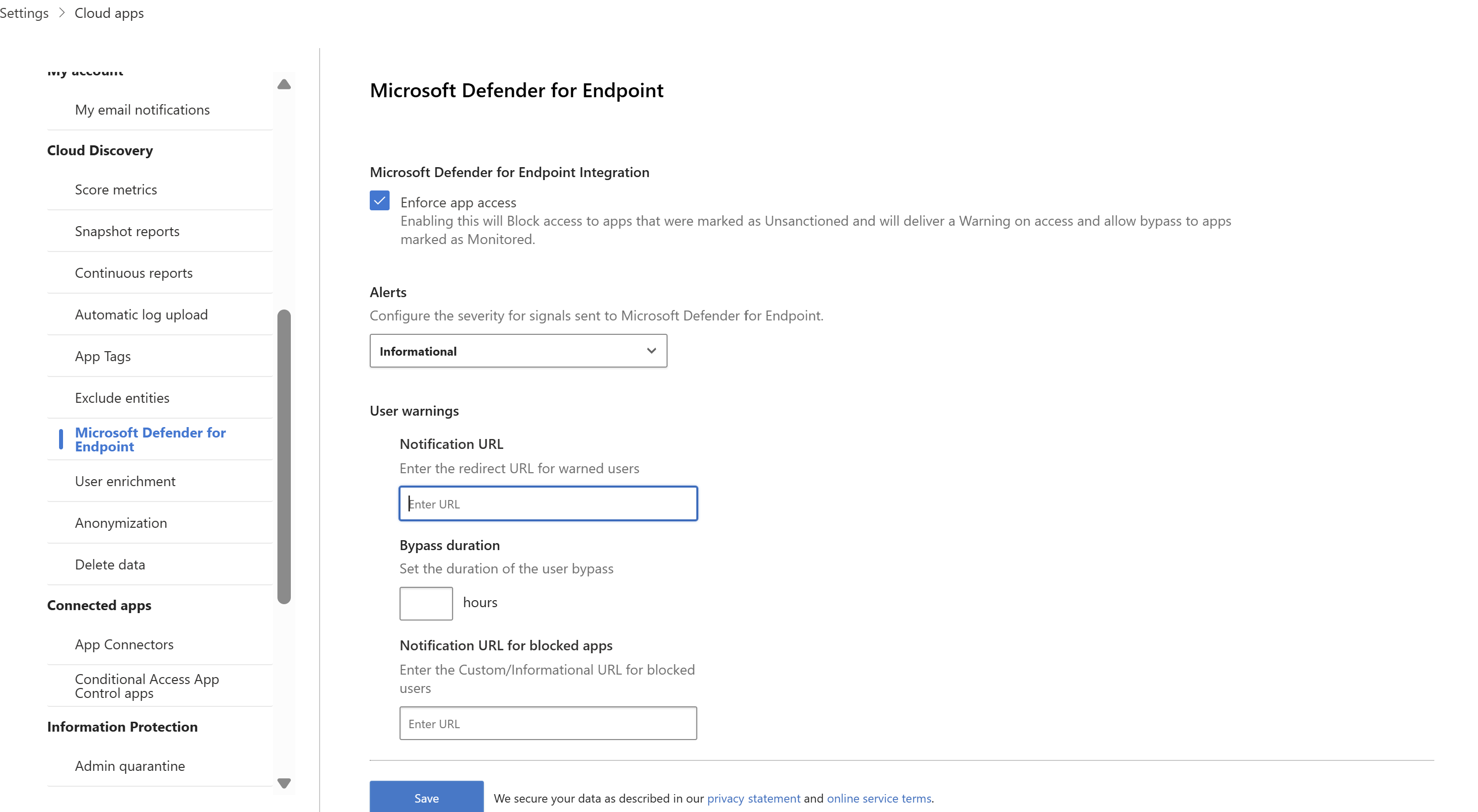 在 Microsoft Defender 入口網站中,選取 [設定]。 然後選擇 [雲端應用程式]。 在 [Cloud Discovery] 底下,選取 [適用於端點的 適用於端點的 Microsoft Defender],然後選取 [強制執行應用程式存取]。