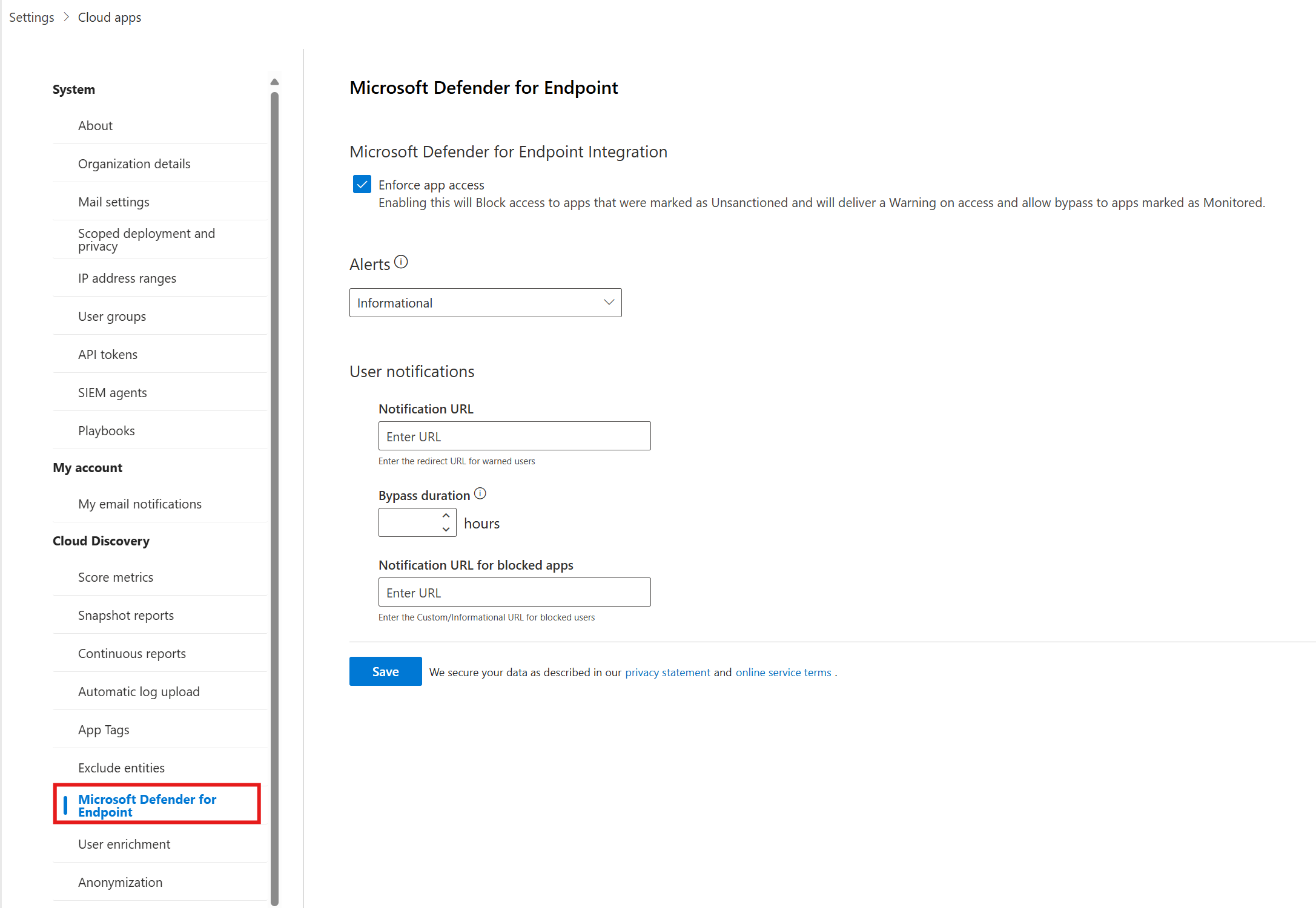 在 Microsoft Defender 入口網站中,選取 [設定>] [Cloud Apps>Cloud Discovery] [>適用於端點的 Microsoft Defender]。