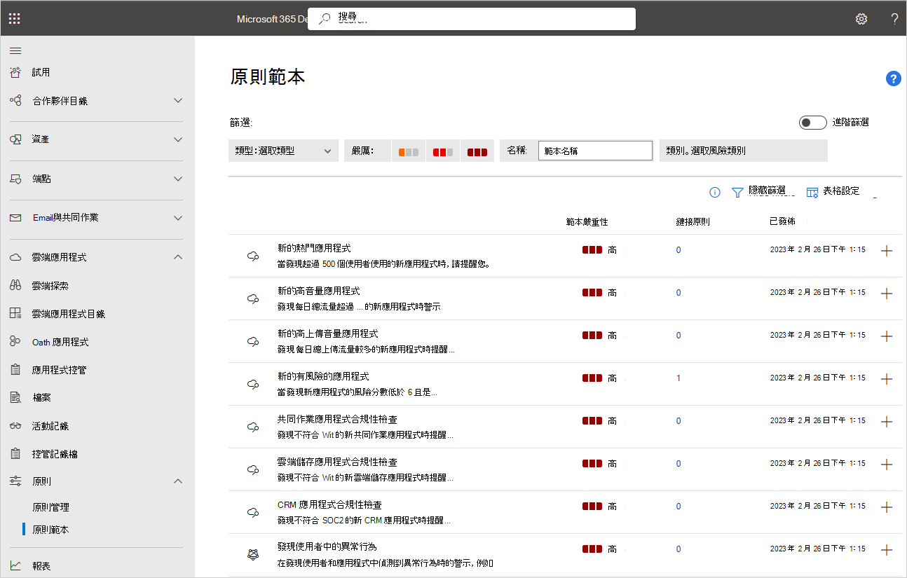 要查看完整政策範本清單,請在 Microsoft Defender 入口網站的雲端應用程式中,前往「政策 ->政策範本」。 例如: