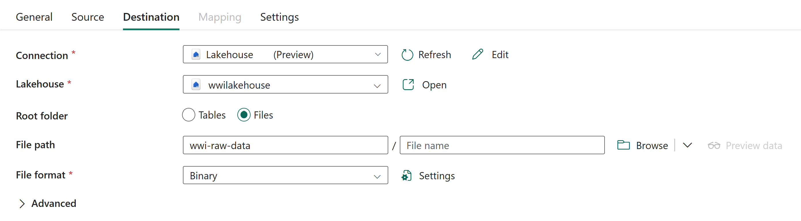 目錄名稱 (第二個文字方塊):WideWorldImportersDW/parquet遞迴 已核對 檔案格式 Binary 從所選複製資料活動的 目的地 索引標籤中,指定下列屬性: