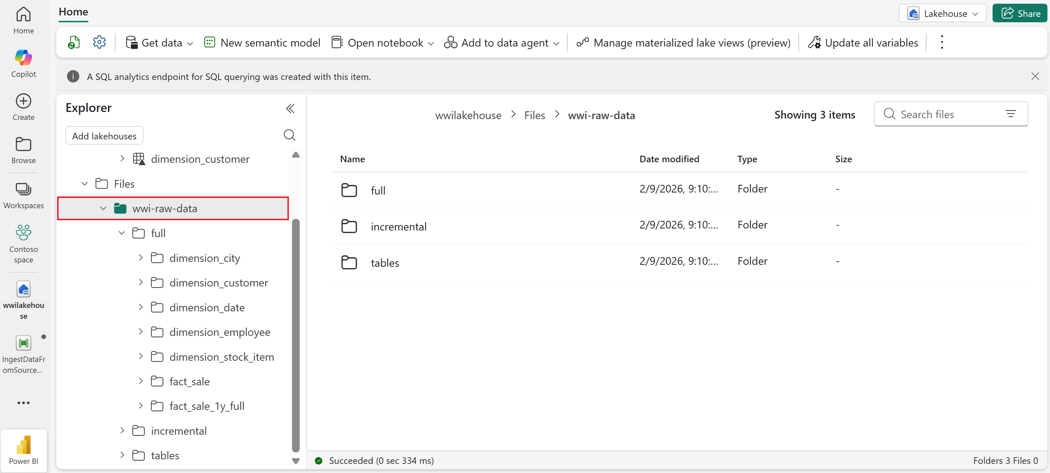 複製活動成功之後,請開啟您的湖庫 (wwilakehouse) 以檢視資料。 重新整理 [檔案] 區段以查看擷取的資料。 檔案區段中會出現新的資料夾 wwi-raw-data ,而 Azure Blob 資料表的資料會複製到該處。
