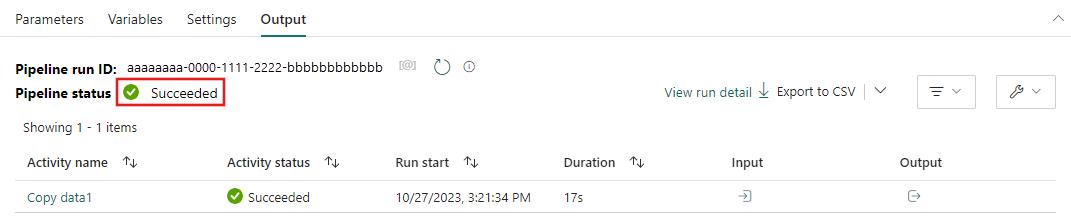 當您的變更儲存後,管線就會開始執行。 您可以在畫布底部的 [輸出] 索引標籤中查看運行的進度。