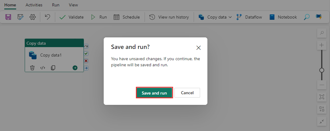 隨選執行:在管線編輯器中選取 [執行] 以觸發立即執行。 您必須在管線開始之前儲存任何變更。