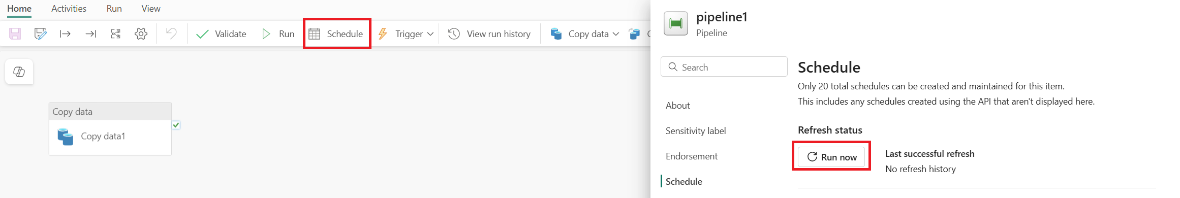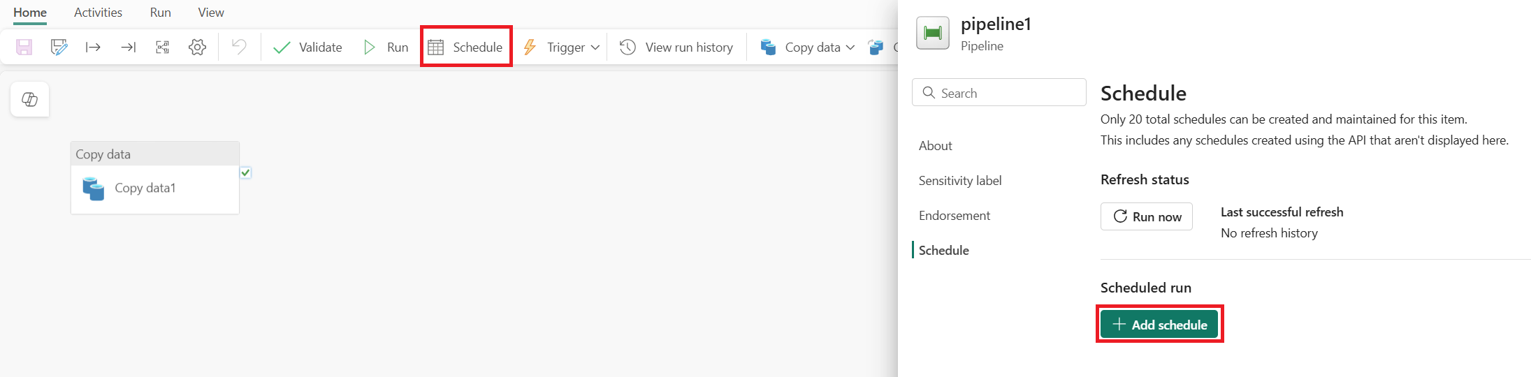 選取 [首頁] 索引標籤頂端橫幅中的 [排程],然後選取 [新增排程] 以檢視您的選項。 根據預設,您的管線不會按照排程運行。