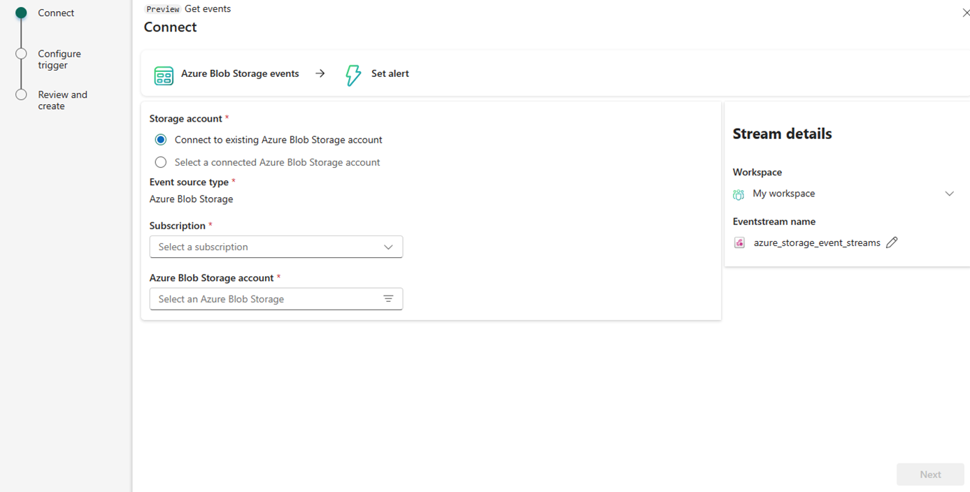 「設定警示」面板隨即開啟。 您可以在此處使用 Data Activator 警示服務定義觸發器的來源事件。 如有需要,您可以將值新增至參數。