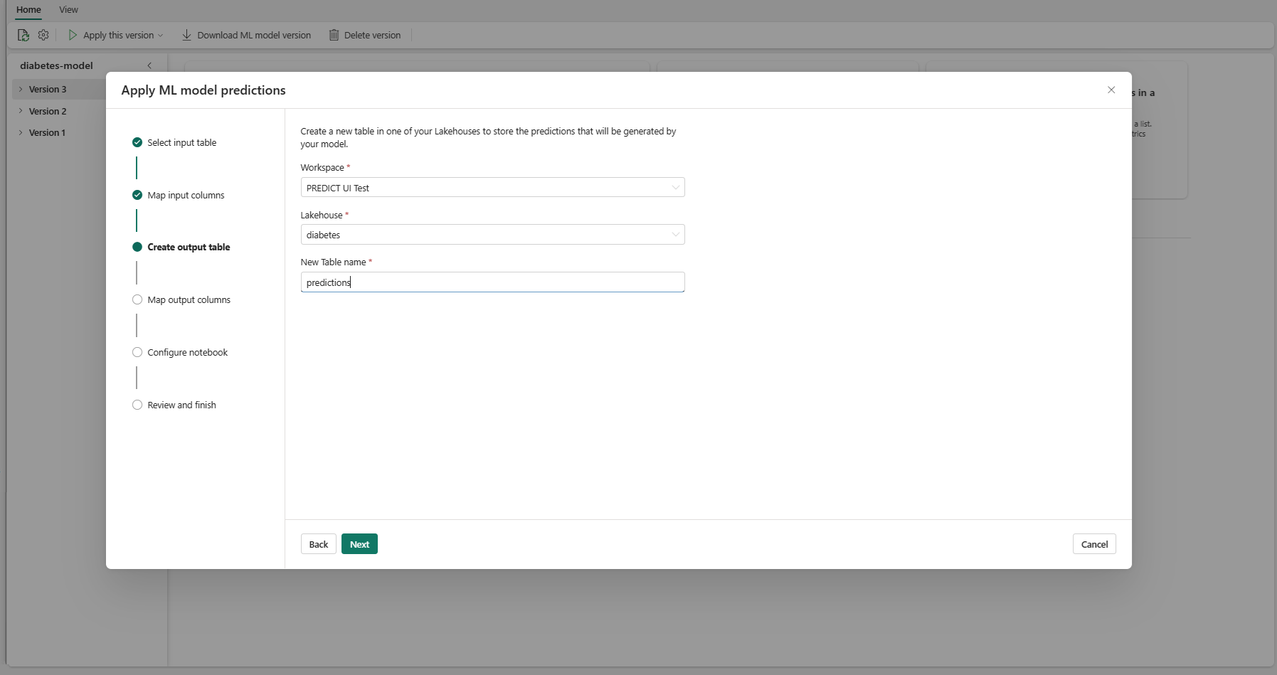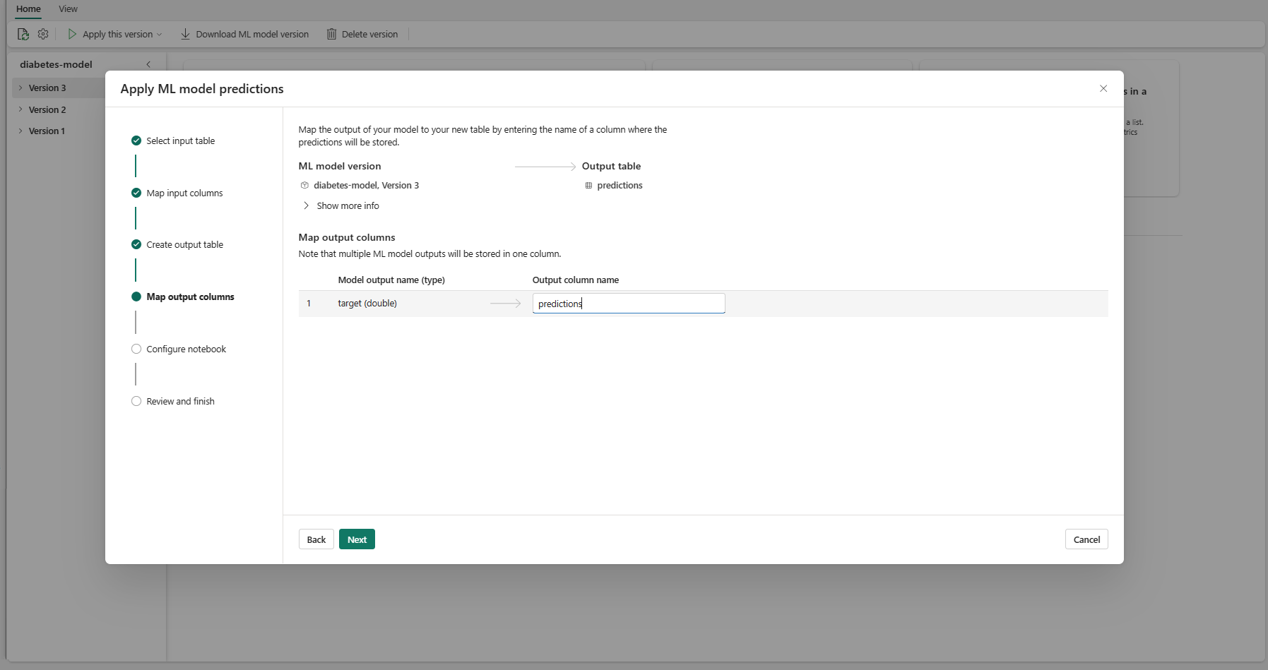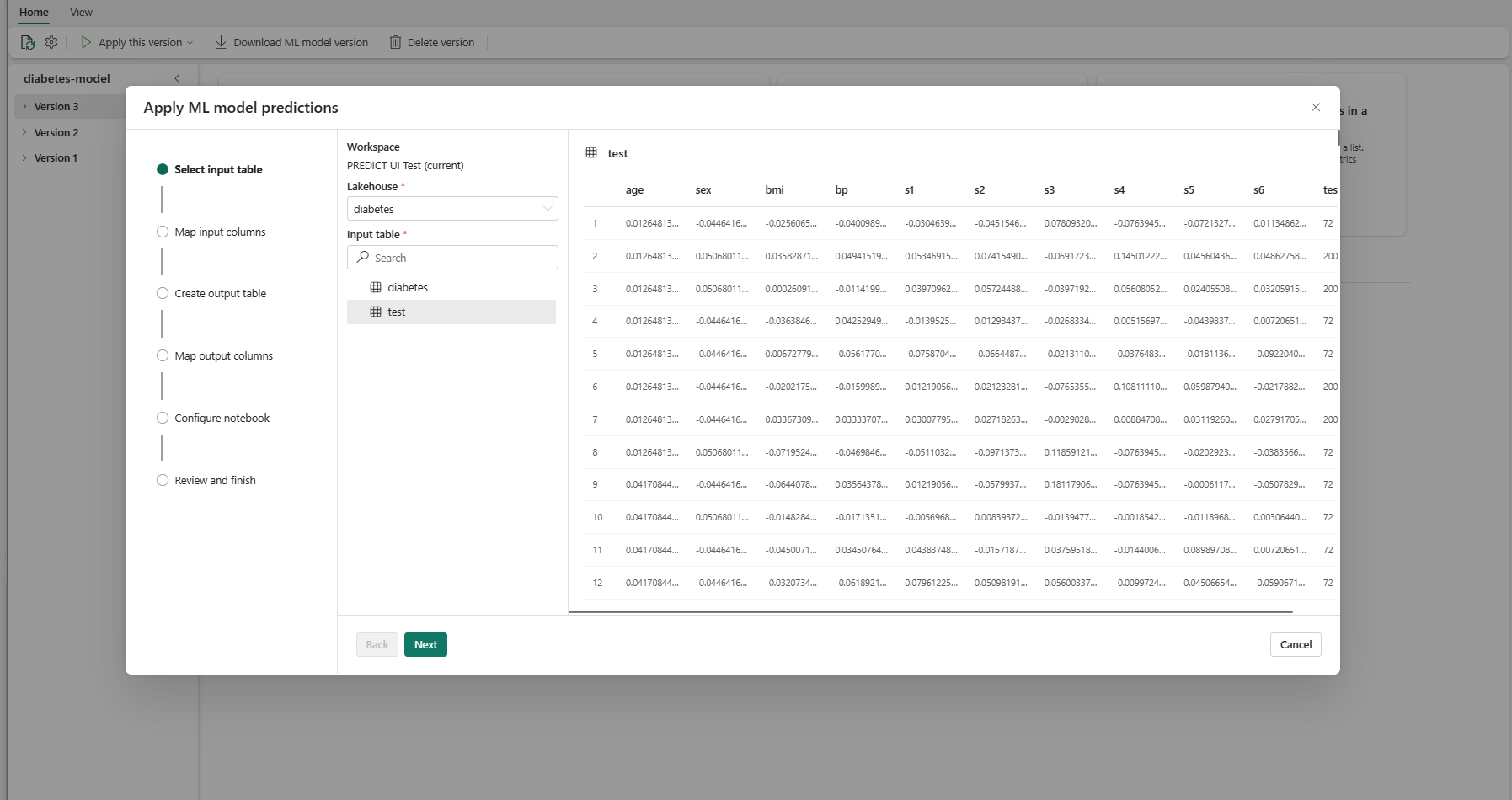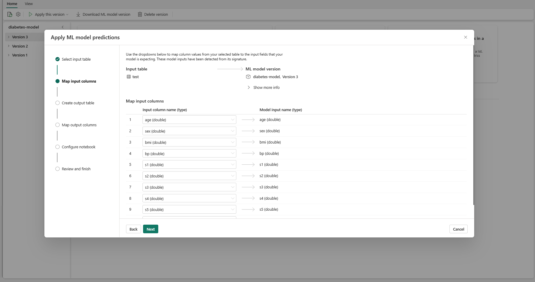 test指定您需要作為模型輸入的 DataFrame 資料列(在此案例中,全部都是) - 選擇新輸出資料列的名稱(在此案例中為