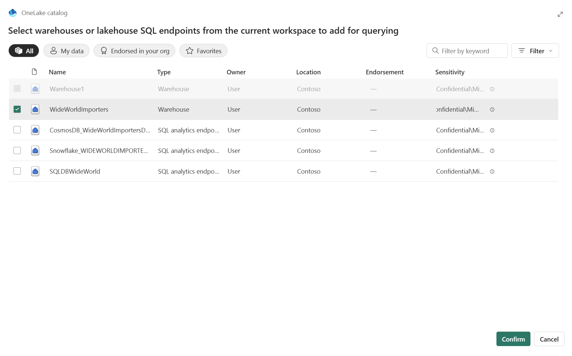 您可以在 Microsoft Fabric 的目前作用中工作區中,對倉儲和資料庫執行跨資料庫查詢。