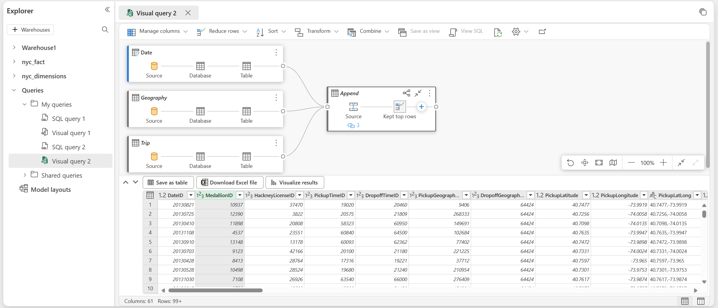 有數種方式可讓您在相同的 Microsoft Fabric 工作區內撰寫跨資料庫或跨倉儲查詢,在本節中,我們會探索一些範例。 您可以聯結資料表或檢視表,以在當前工作區內執行跨倉庫查詢。