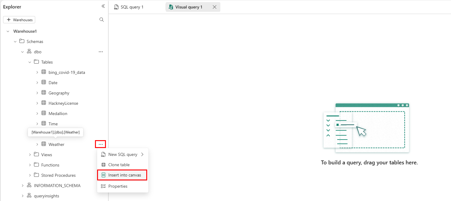 ...動作功能表,然後選擇 插入至畫布。 或者,您可以選取、按住數據表,然後將數據表從 Explorer拖曳到視覺查詢中。