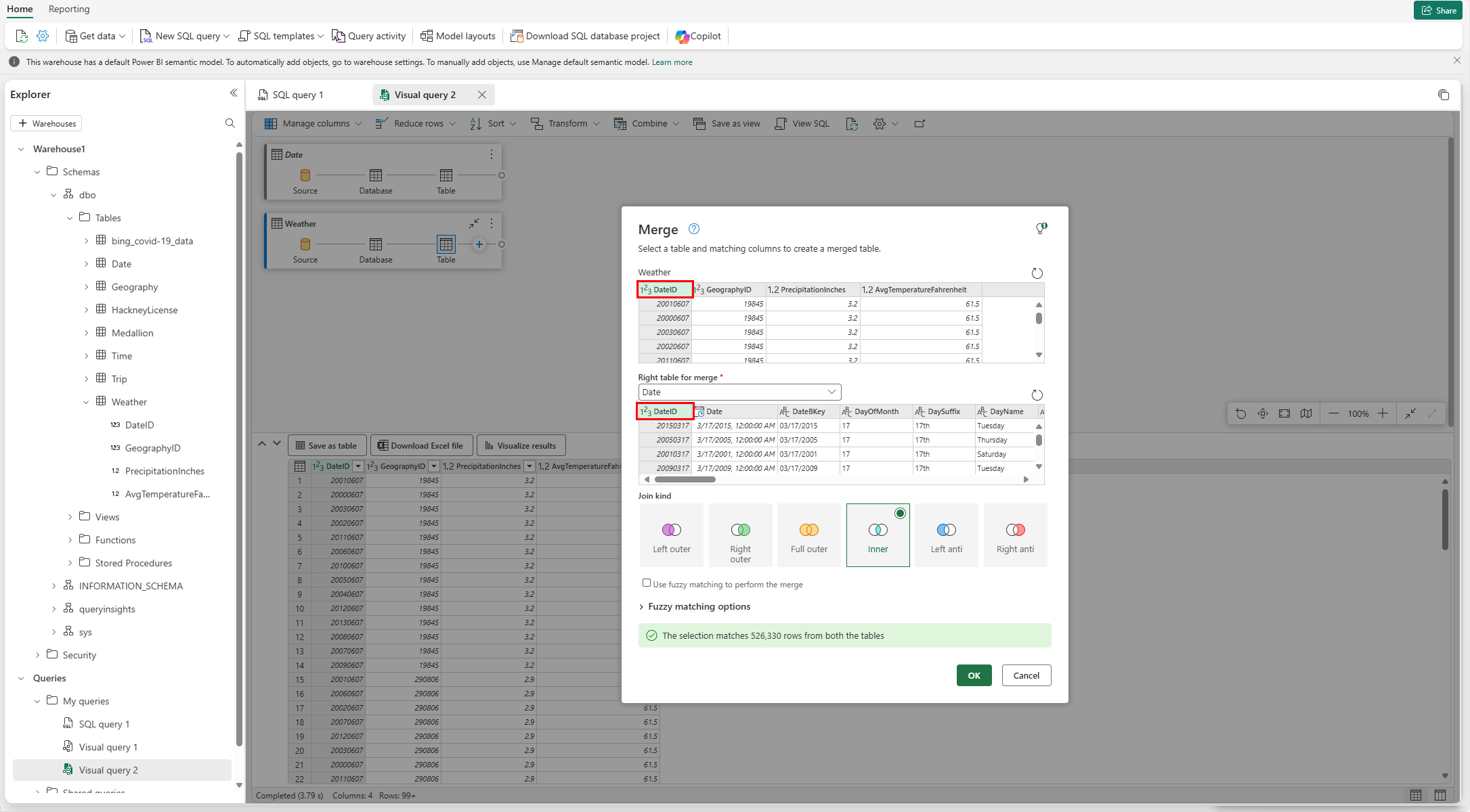 Date索引鍵數據行上的Weather聯結來聯結 和DateID數據表。結果集的連結會顯示合併的資料。 您可以使用 Visual 查詢編輯器工具列中的其他函式來操作查詢。 您也可以將產生的查詢儲存為新的檢視或檢視 T-SQL。