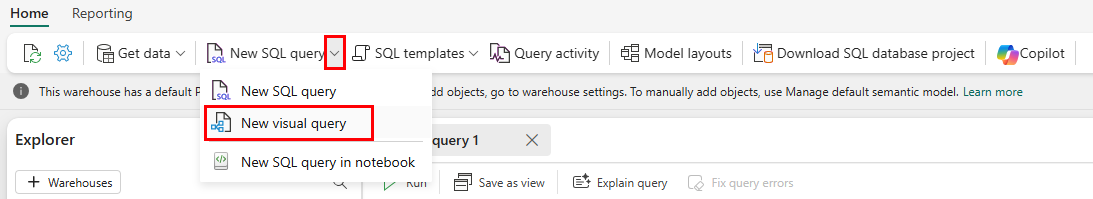 隨即會出現新索引標籤,以便您建立視覺化查詢。 若要將資料表新增至視覺查詢,在 Explorer中右鍵點擊資料表,或選取其
