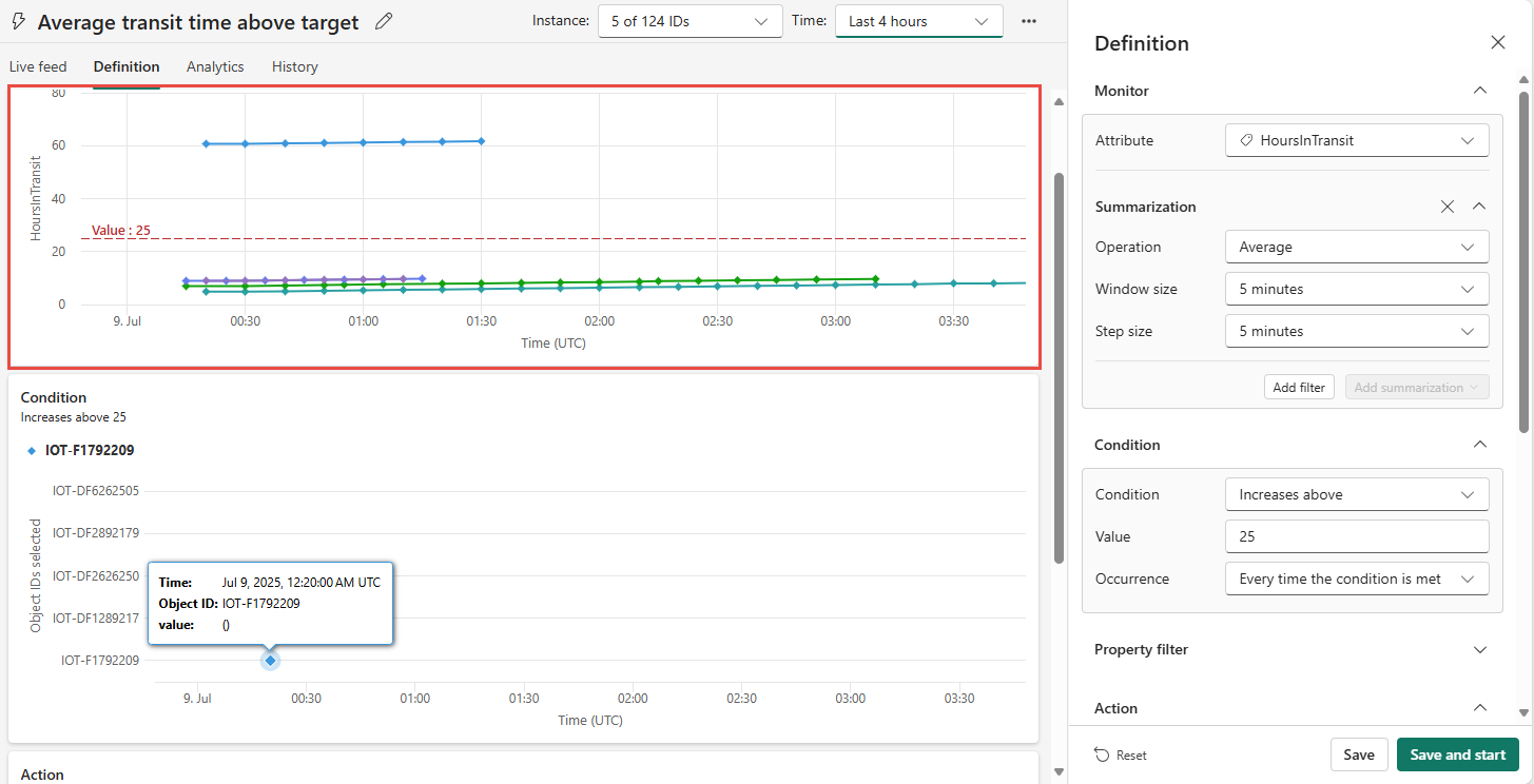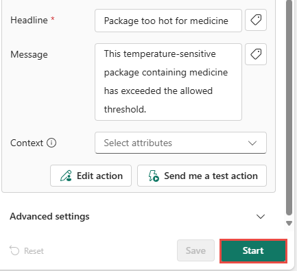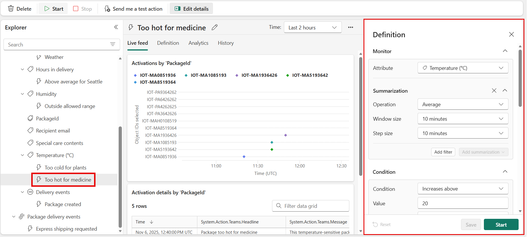 選擇開始。 這會導致規則啟動。 每當藥包過熱時,您就會收到 Teams 訊息。 規則應該每小時觸發數次。