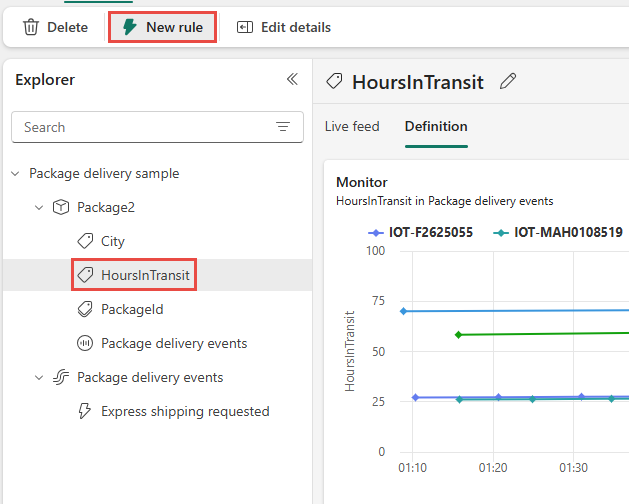 您應該會在 [總管] 窗格中看到 HoursInTransit 底下的規則。 選取規則。 在中間窗格中,選取頂端的鉛筆圖示,並將名稱更新為 高於目標的平均傳輸時間。